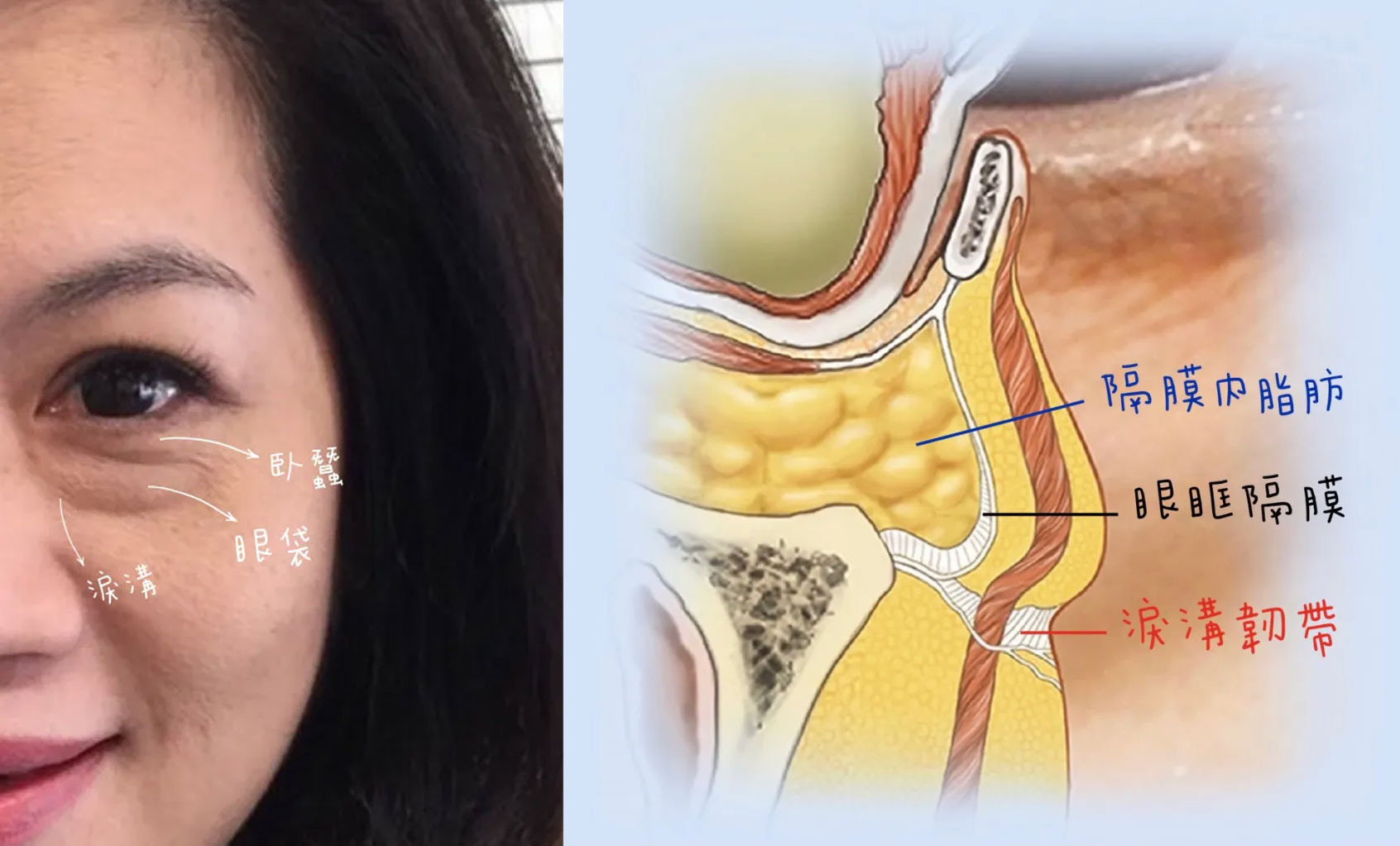隨著年齡增長、生活作息、過度使用3C產品…,在膠原蛋白及彈力纖維慢慢流失的情況下,導致眼周肌膚和眼眶隔膜的老化及鬆弛,下眼眶脂肪膨出。