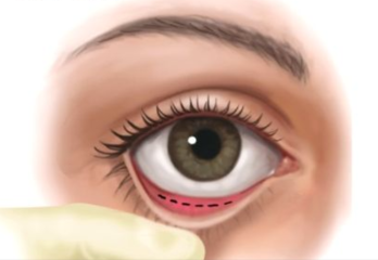 術前標記眼袋脂肪範圍與淚溝補脂肪的區域1、使用局部麻醉藥水,讓手術過程更加舒適使用微創內開法(transconjunctival approach blepharoplasty)如下圖所示傷口在眼睛結膜內(虛線處),外面看不到疤痕