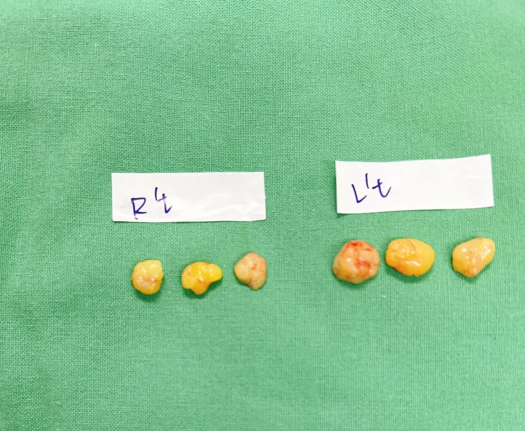 由內開法所移除的眼袋脂肪因眼袋脂肪,不足以填補淚溝,局部麻醉後取肚子或大腿的脂肪來進行脂肪移植。