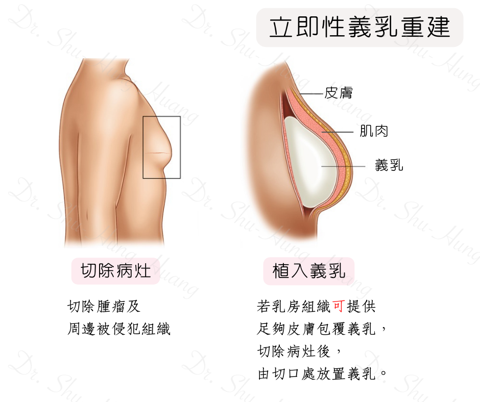 乳房外科或一般外科切除病灶後,如果乳房組織可提供足夠的皮膚包覆可立即放置義乳。手術方式與內視鏡隆乳相似,由病灶切除傷口處置放義乳。