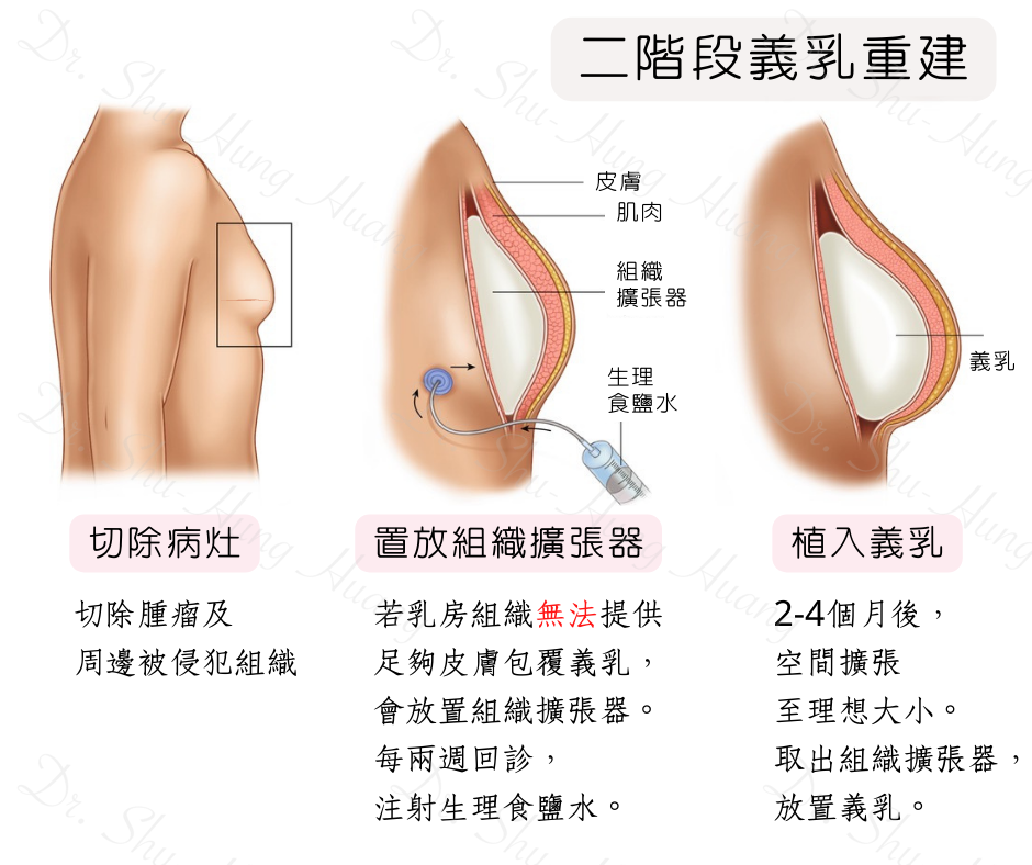乳房外科或一般外科切除病灶後,因胸部皮膚軟組織不足、胸壁緊繃、皮膚張力過大,無法直接放置義乳。