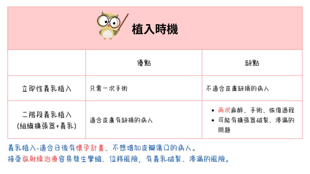 日後若有懷孕的計畫、不想另外增加取皮瓣的傷口、非常擔心長時間麻醉的風險,可以採用義乳重建。